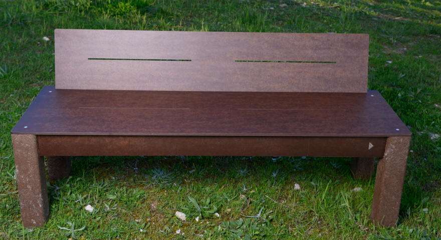 Estrutra em madeira ou perfis de plástico 100% reciclado e revestimento em compácto denólico colorido.